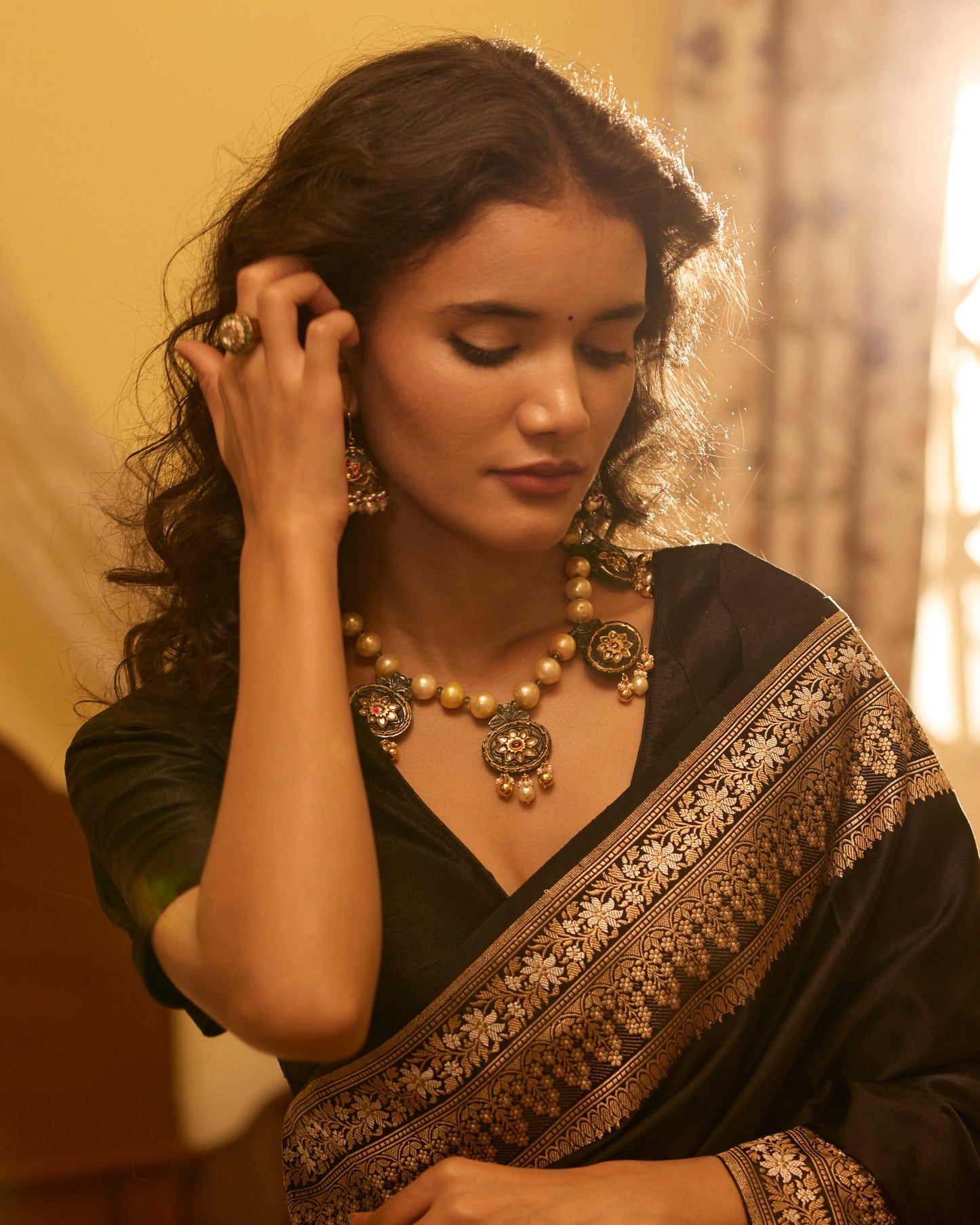 The Motimala necklace by Vasundhra Raj Luxury Jewellery is handcrafted in 22 kt gold, featuring carved jade stones, pearls, and delicate gold bead accents. A perfect addition to wedding jewellery, Whether worn solo or layered with heirloom pieces, it radiates a royalty.